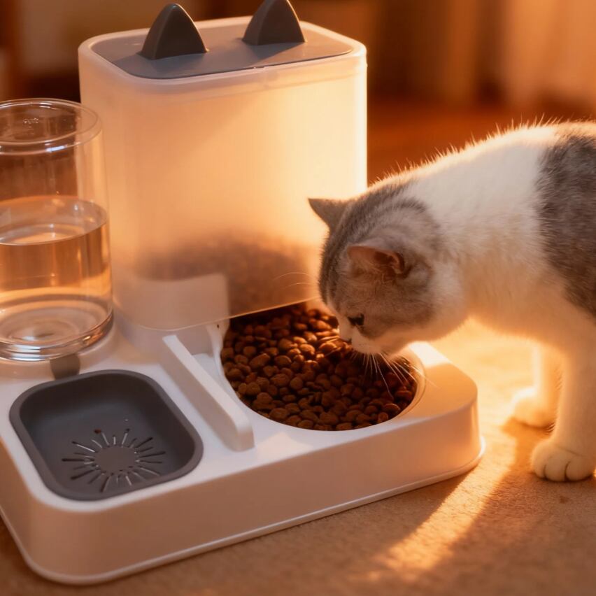 この自動給餌・給水ボウルは、そんなあなたの「もしも」を「大丈夫」に変えます。難しい設定は一切なし!置くだけで、愛猫に新鮮なごはんと水を届け続けます。