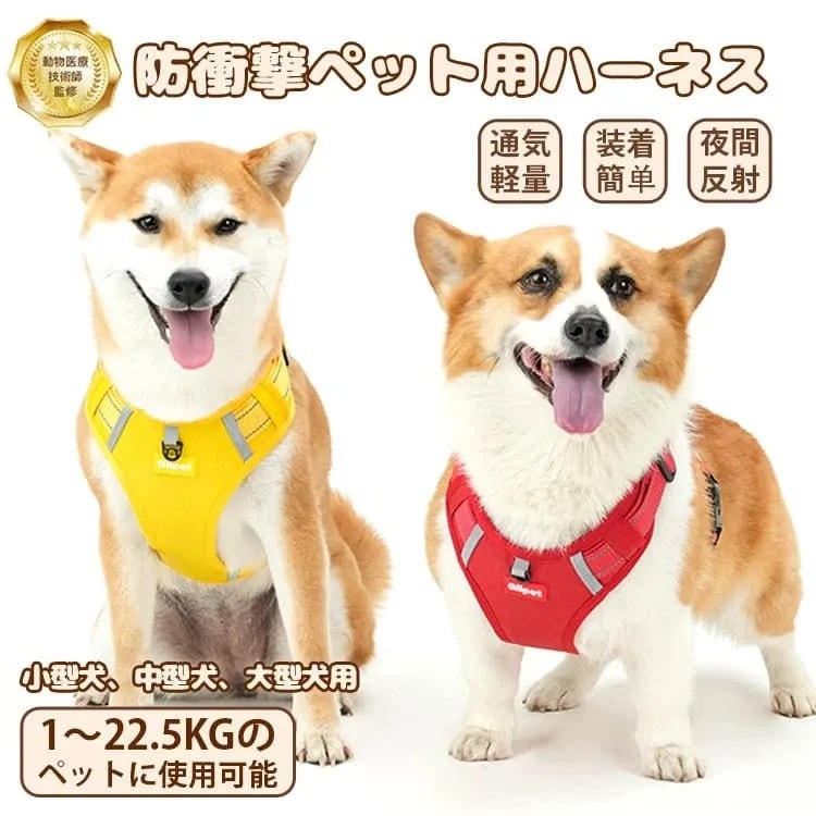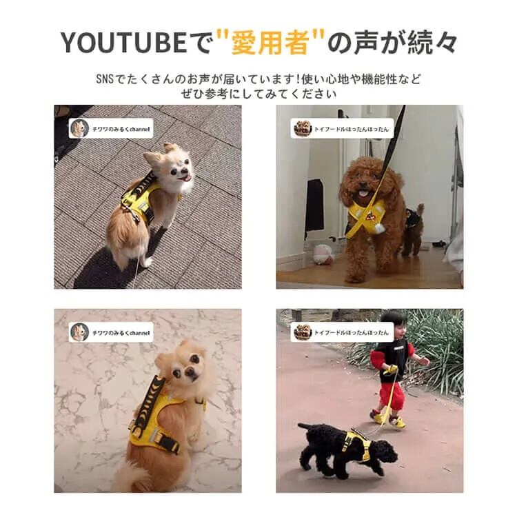 ・快適な装着感サイズXS (2-5KG) 、XL (30-45KG)、S (5-7KG)、M (7-10KG)、L (10-30KG)カラーレッド(反射リード付き)、オレンジ(反射リード付き)、ブラック(反射リード付き)、イエロー(反射リード付き)素材高級なオックスフォード素材商品詳細愛犬のカラダに触れる部分はすべて上質の生地が覆っています。そのため、肌触りがソフトで、摩擦による痛みはありません。カラダに食い込んで不快感を与えないように、ハーネスの幅が広めに作られています。ワンチャンの体型に合わせて調節しておけば簡単着脱!バックルはサイズ調整が可能なので微妙な調整もできます。ハーネスはかわいいだけでなく、夜になると反射するので安全、暗い夜道でも目立ちます。
