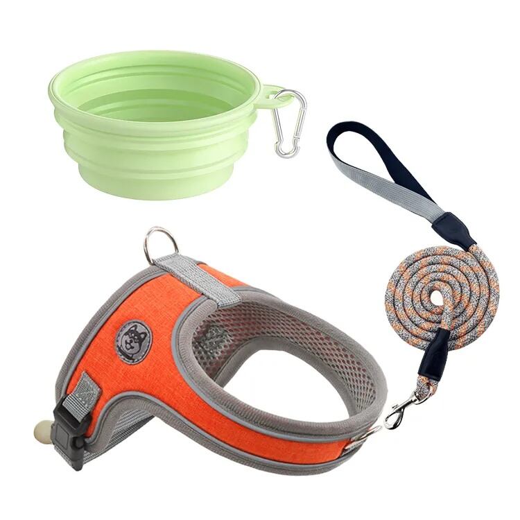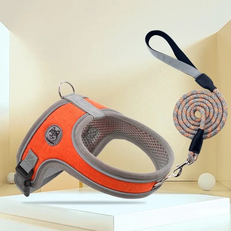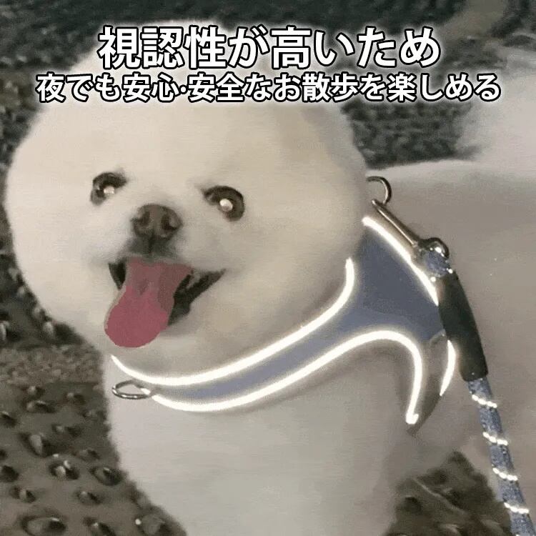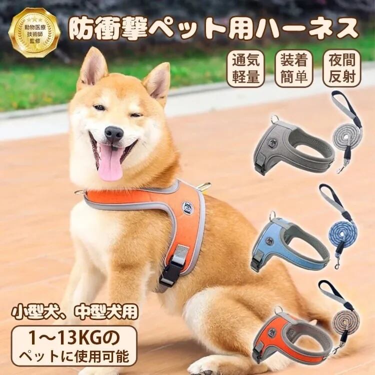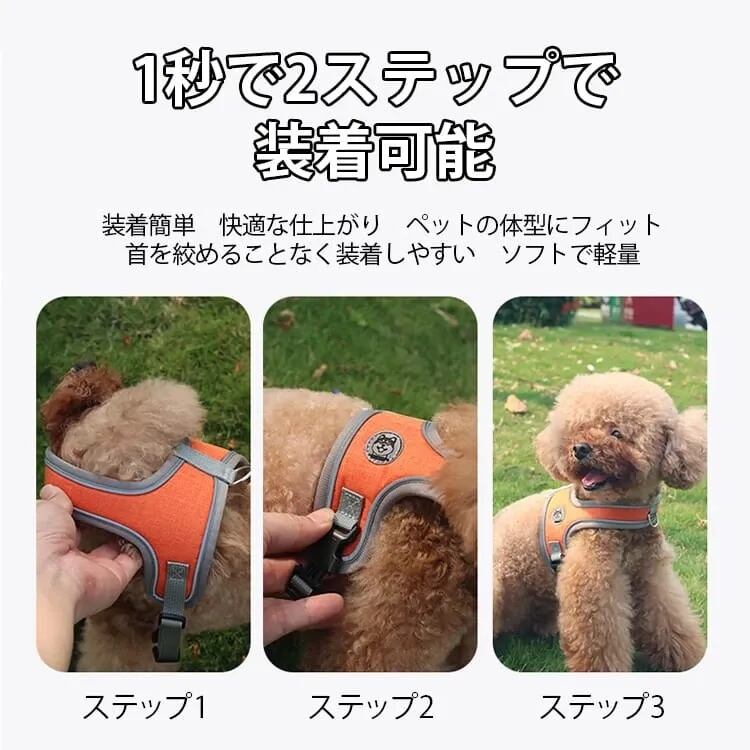 ・リード付きサイズXS:胴回り28-34/約1-2.5kg、S:胴回り 34-42/約2.5-4kg、M:胴回り 39-52/約4-8kg、L:胴回り 49-62/約8-13kgカラーオレンジ(リード付き)、ブルー(リード付き)、グレー(リード付き)素材ナイロン、メッシュ商品詳細愛犬の体に触れる部分は全範囲が柔らかく上質のナイロンメッシュ生地が覆っています。そのため、肌触りがソフトで、摩擦による痛みはありません。頭からかぶってとめるだけ、抱き上げる必要がありませんのでシニア犬や猫ちゃんにも楽々取付。アジャスターで幅広いサイズに調整可能。一度サイズを調節を行えばバックルで止めるだけの簡単着脱仕様。ハーネスはかわいいだけでなく、夜になると反射するので安全、暗い夜道でも目立ちます。