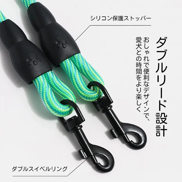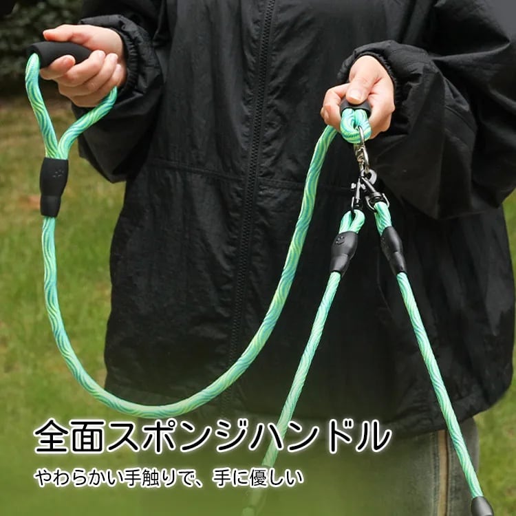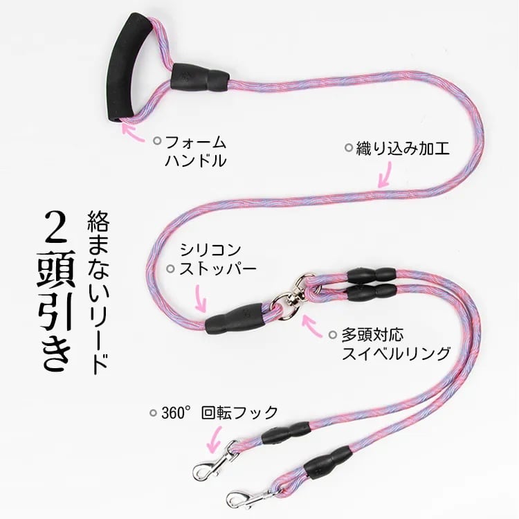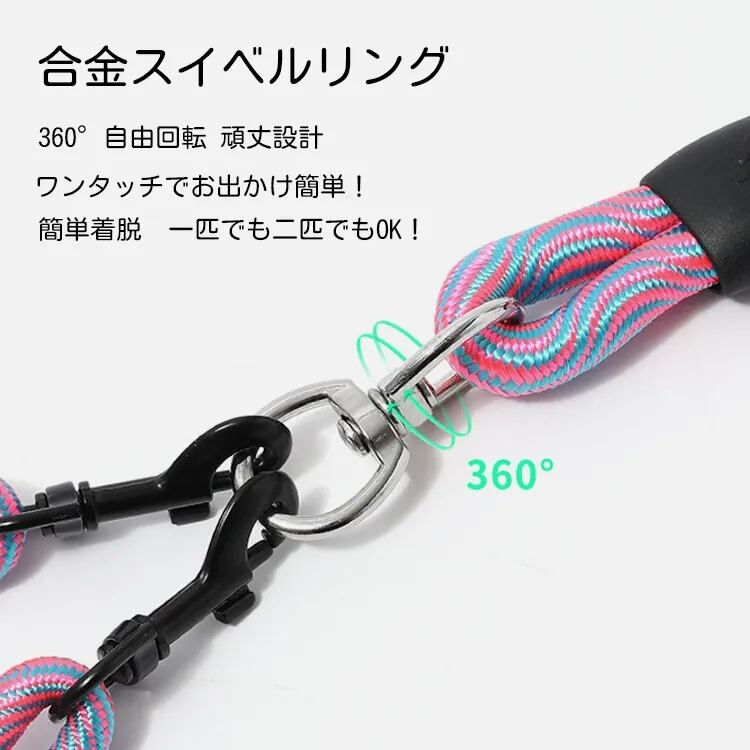 2頭同時引き対応で多頭飼いに最適?360°回転設計で絡まない?滑り止めスポンジハンドルで快適な握り心地?高耐久ナイロンロープで丈夫で安心?カラー
