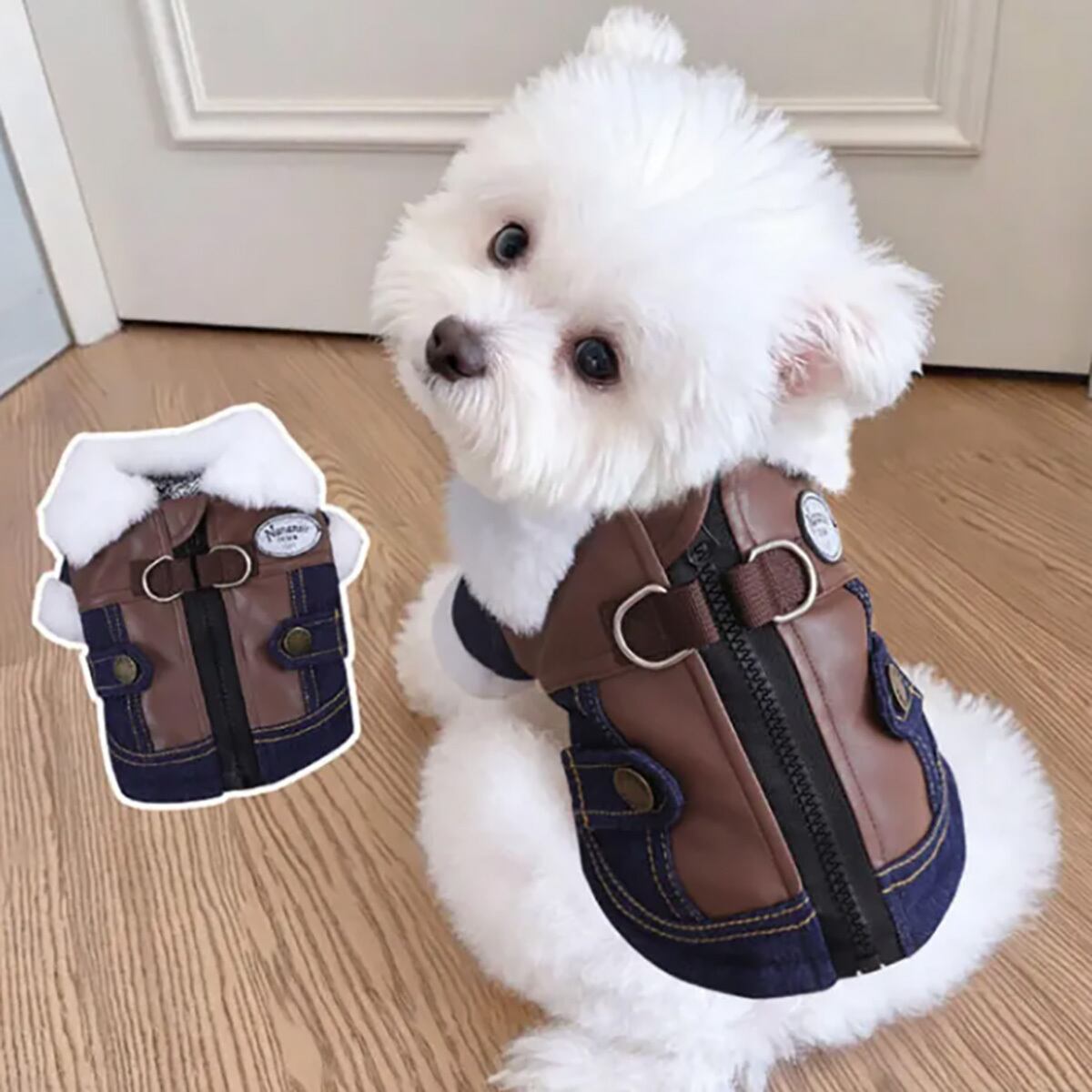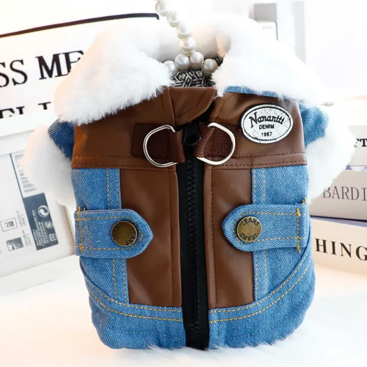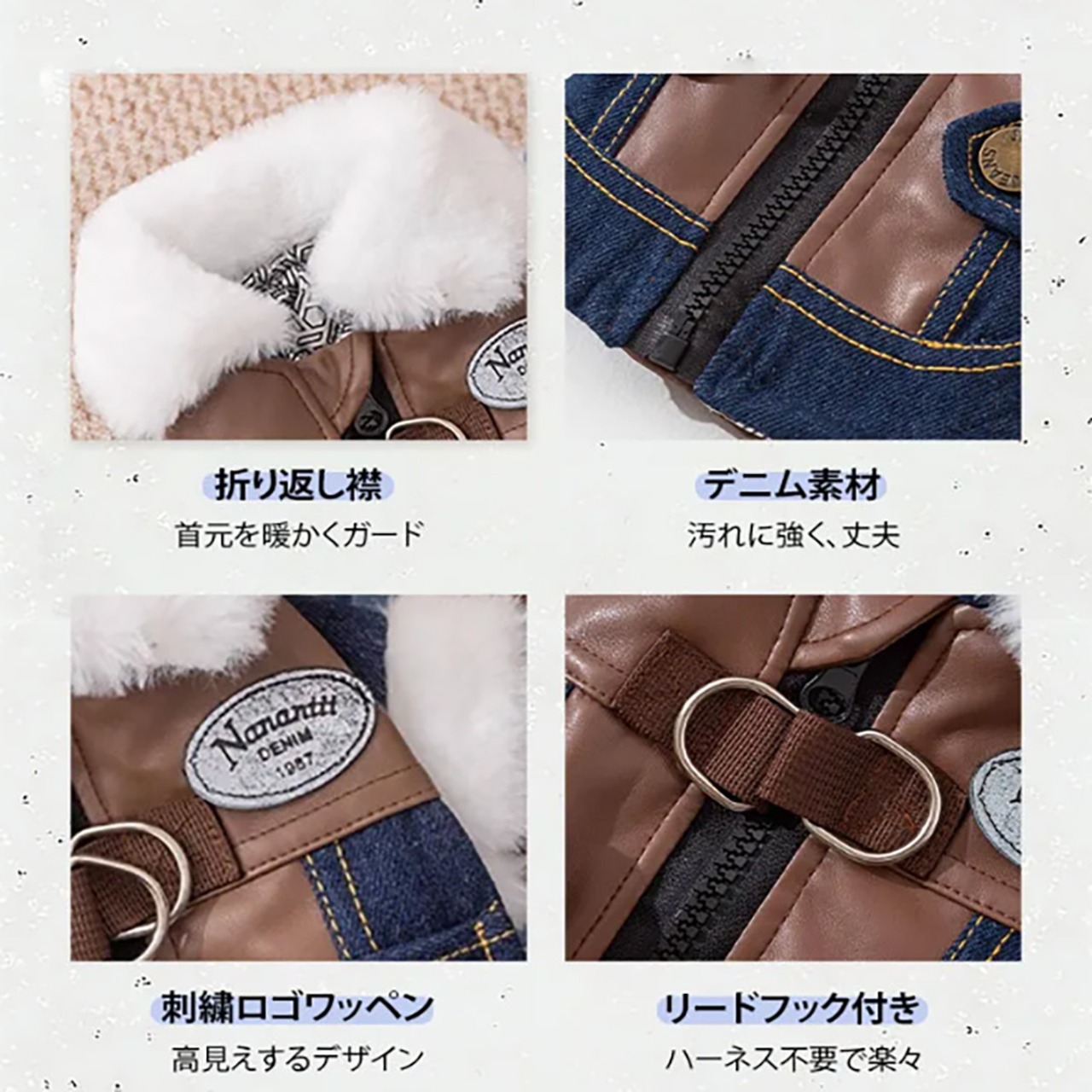 ペット用中綿デニムジャケット 犬猫兼用 グラフェン蓄熱中綿 デニムジャケット 秋冬新作 冬用 防寒 保温コート ライダース風 北欧デザイン 超軽量 静電気防止 リードフック付き 背中ファスナー 着脱簡単 寒さ対策 抗菌 丈夫 ウォッシュドデニム PUレザー製