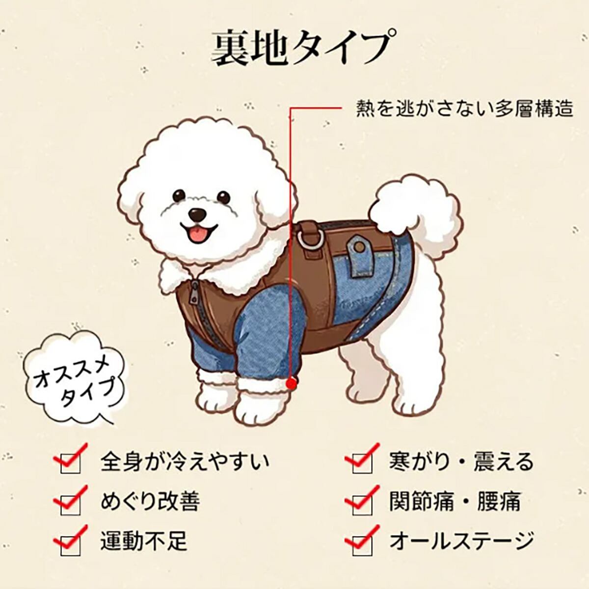 ・裏地に「グラフェン蓄熱綿」を採用した多層構造で、熱を逃がさず、冷えやすい全身をしっか り保温します。寒い日のお散歩で震えるペットや、関節痛・腰痛が気になるシニアにも最適です。