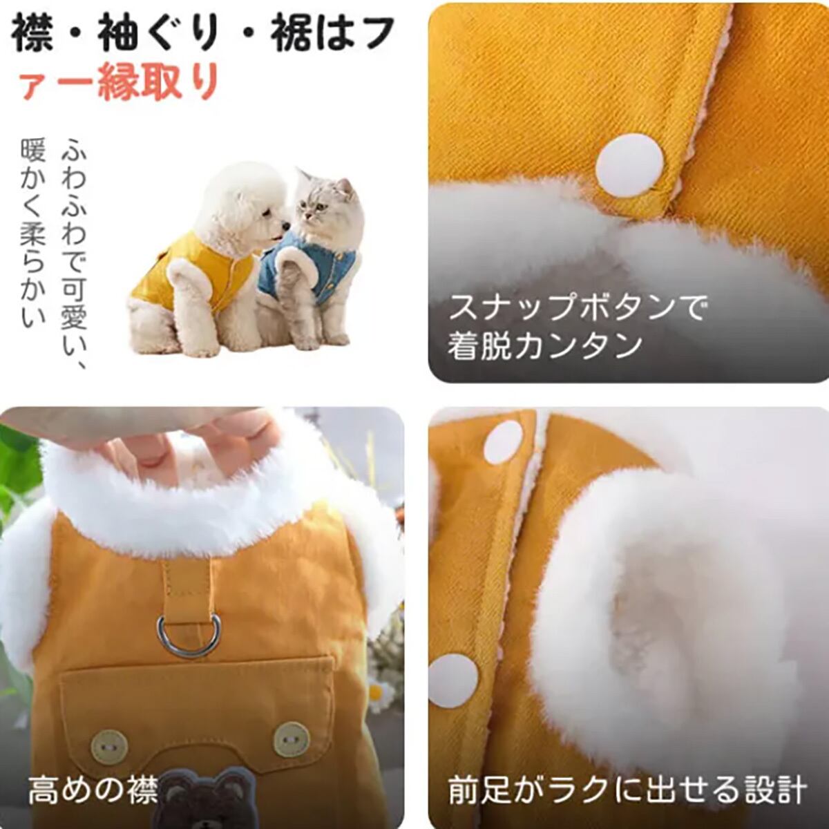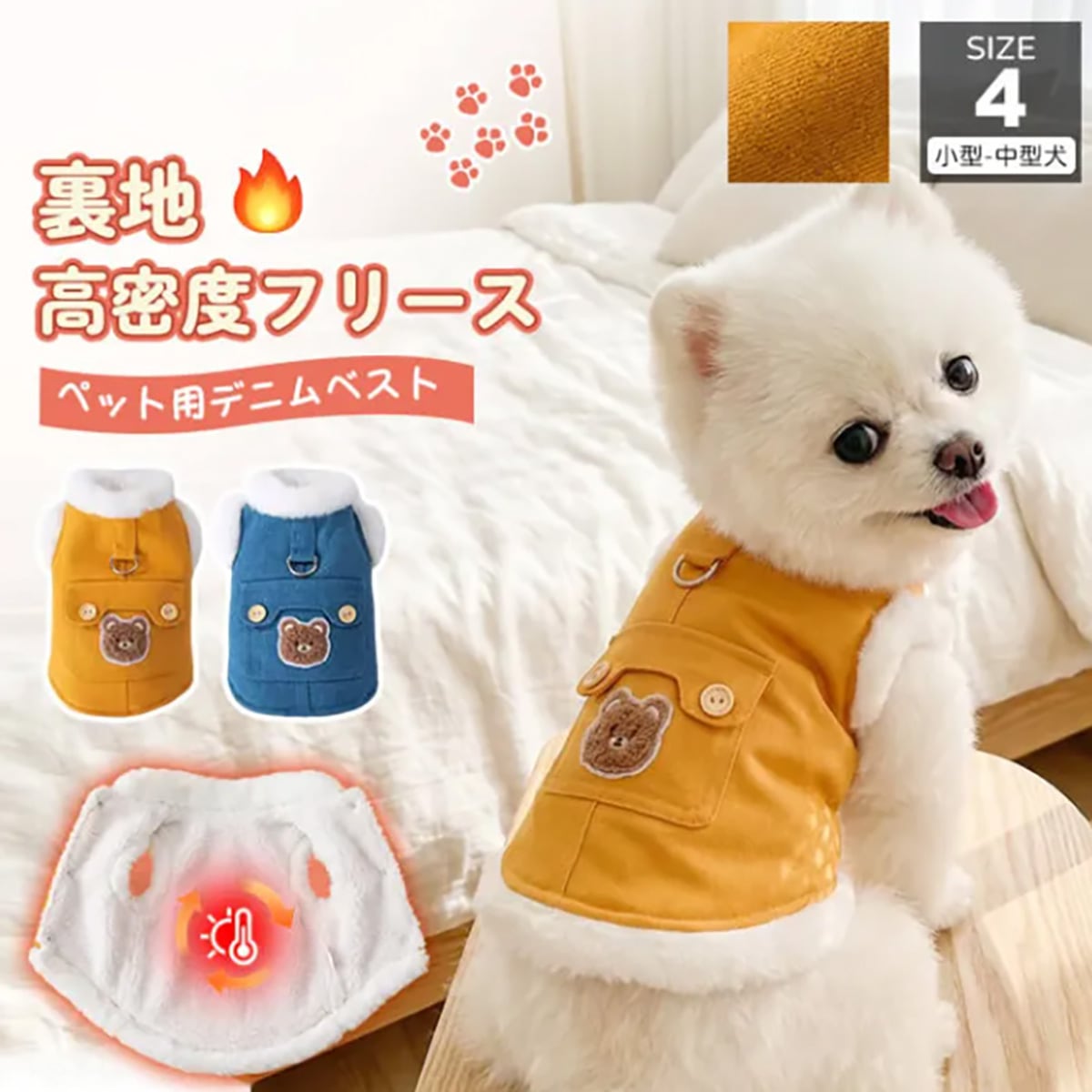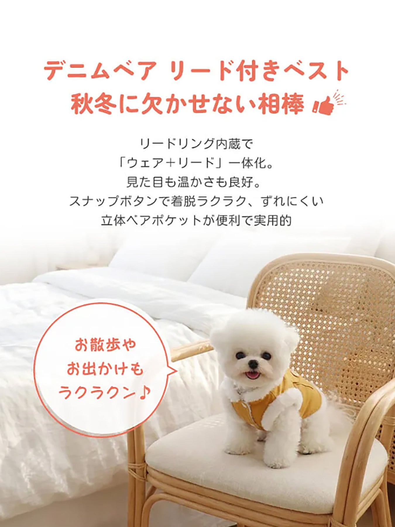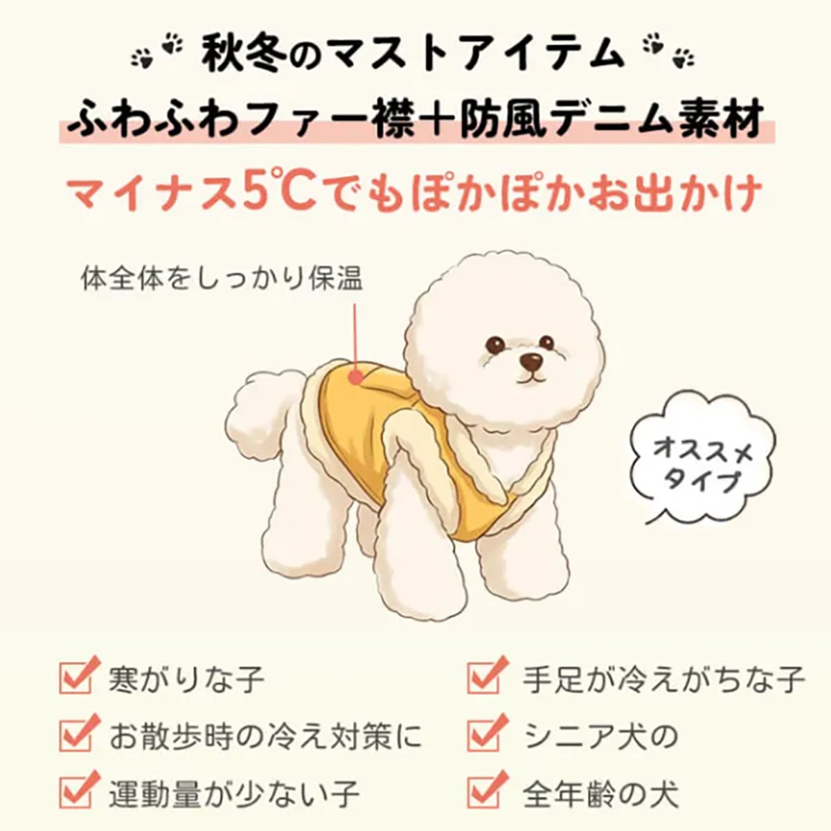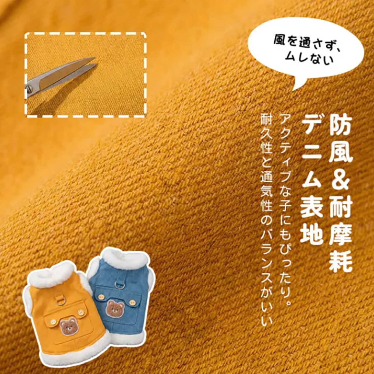 犬服 リード一体型デニムベスト 防寒着 マイナス5℃対応 360°保温 ふわふわファー裏地 高密度フリース スナップボタン 着脱簡単 動きやすい 暖かくてムレない 耐久性 立体ベアポケット おしゃれ ドッグウェア 小型犬 中型犬 お散歩 マストアイテム 寒さ対策