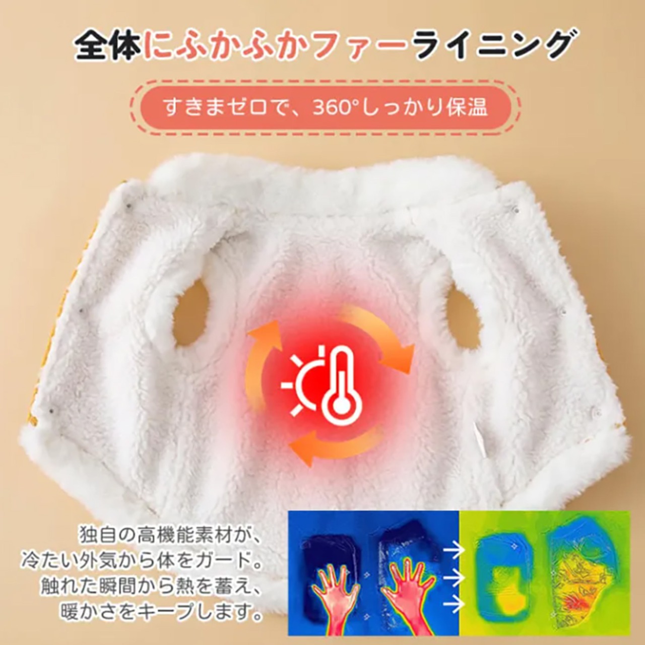耐久性に優れたデニム生地の表地と、全体に施された高密度フランネルファー裏地で、風を通さず360°しっかり保温。マイナス5℃の極寒にも対応し、愛犬を寒さから守ります。