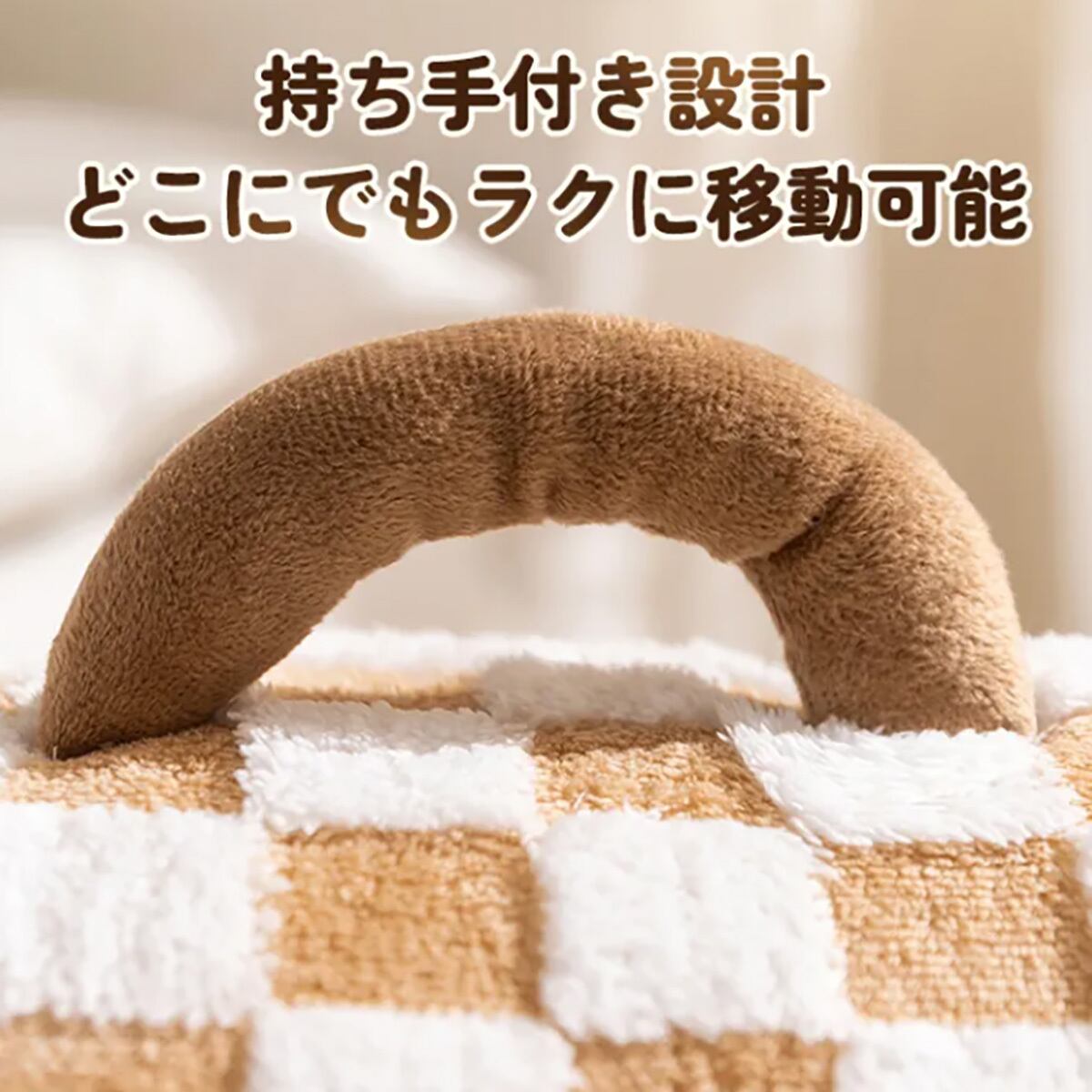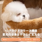 高密度充填でサポート性が良く、横たわっても型崩れしません。さらに、片面は蓄熱フリース、もう片面は通気爽快なリネン風生地の両面仕様で、一年中快適。軽量で持ち手付きなので、どこへでもラクに移動可能です。小型犬から中型犬、多頭飼いにも対応します。