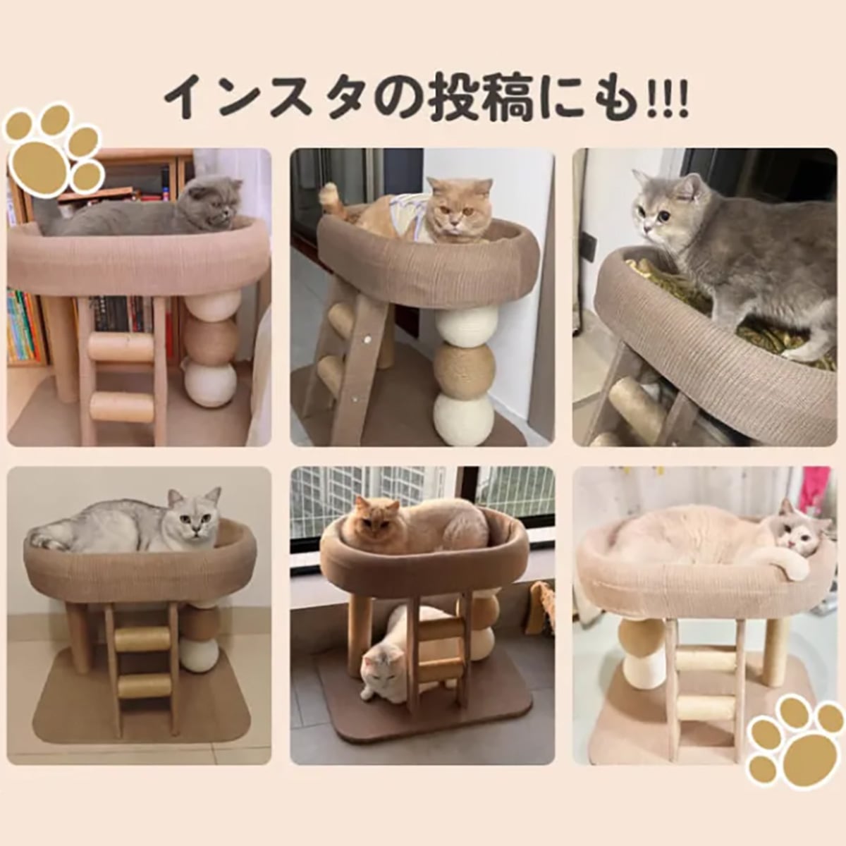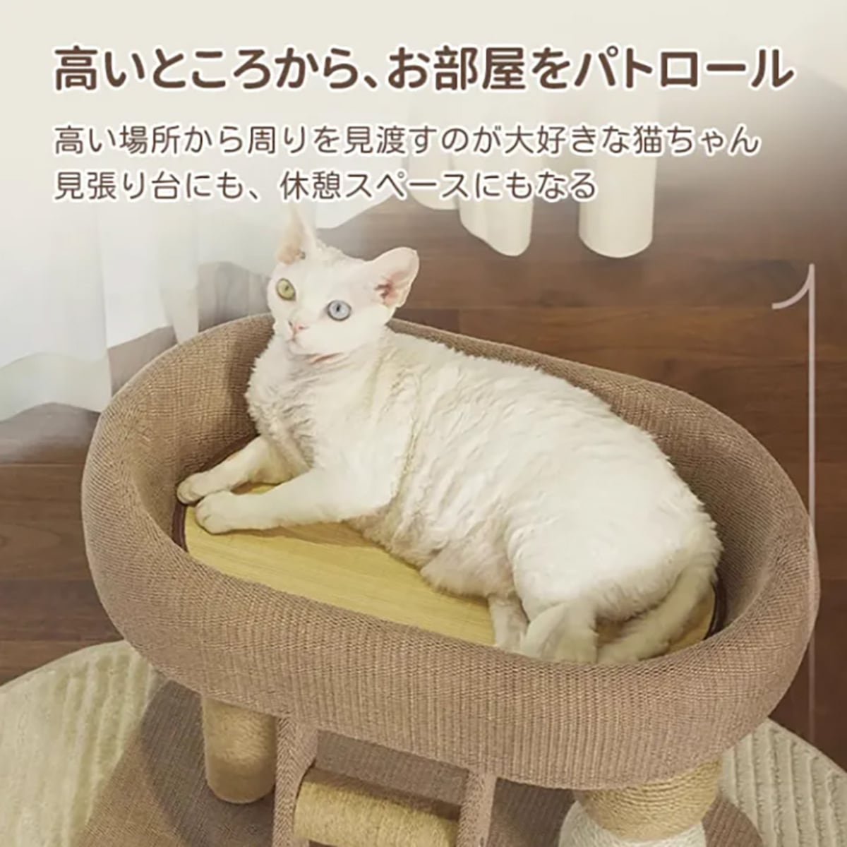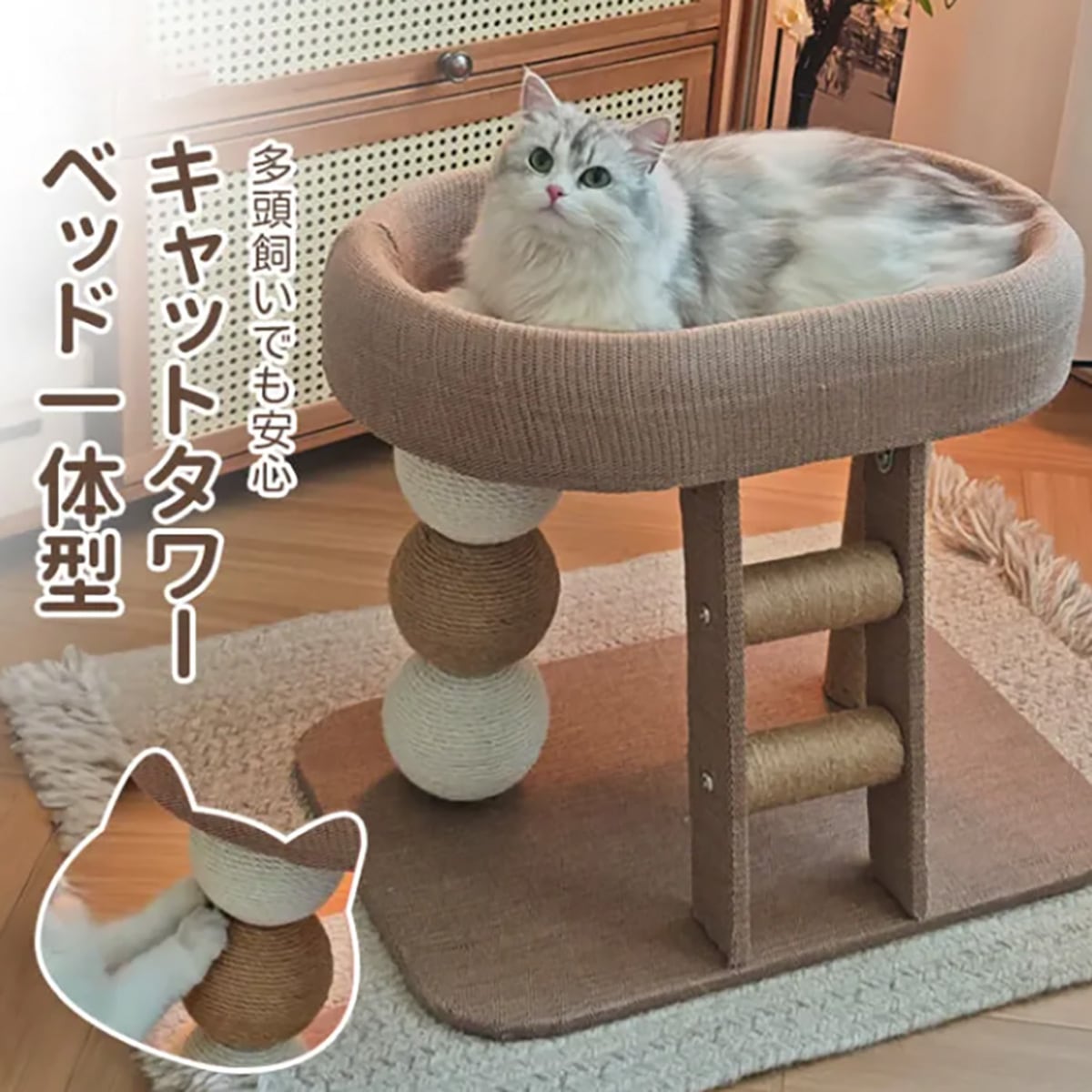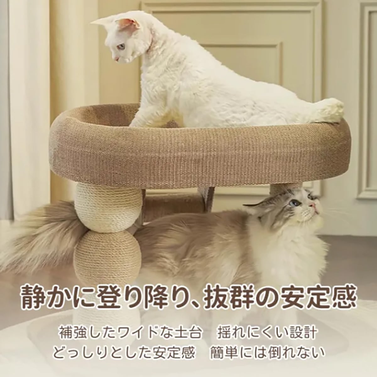 ベッド付きコンパクトキャットタワーは、猫ちゃんの「大好き」を詰め込んだ一台。壁にぴったり設置できる省スペース設計で、コンパクトなお部屋にも気軽に置けます。丈夫な天然サイザル麻の爪とぎポールは研ぎカスが出にくく、遊び心のある麻縄ボールやはしごでストレス解消。広々とした丸形ベッドと見張り台で、ぽっちゃり猫ちゃんも多頭飼いのお家も安心です。揺れにくい安定構造とひんやりマット付属で、一年中快適な猫ちゃんのくつろぎ空間を提供します。