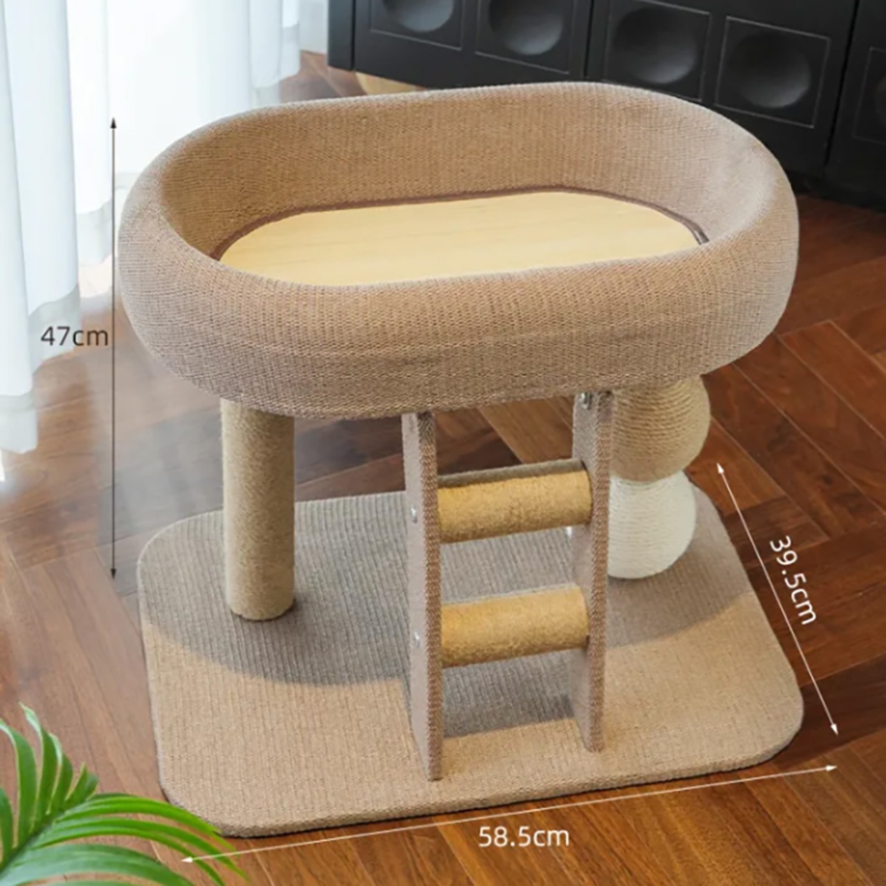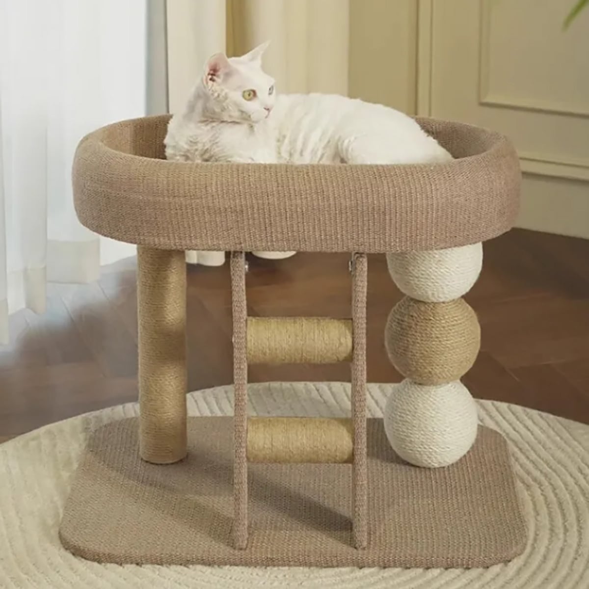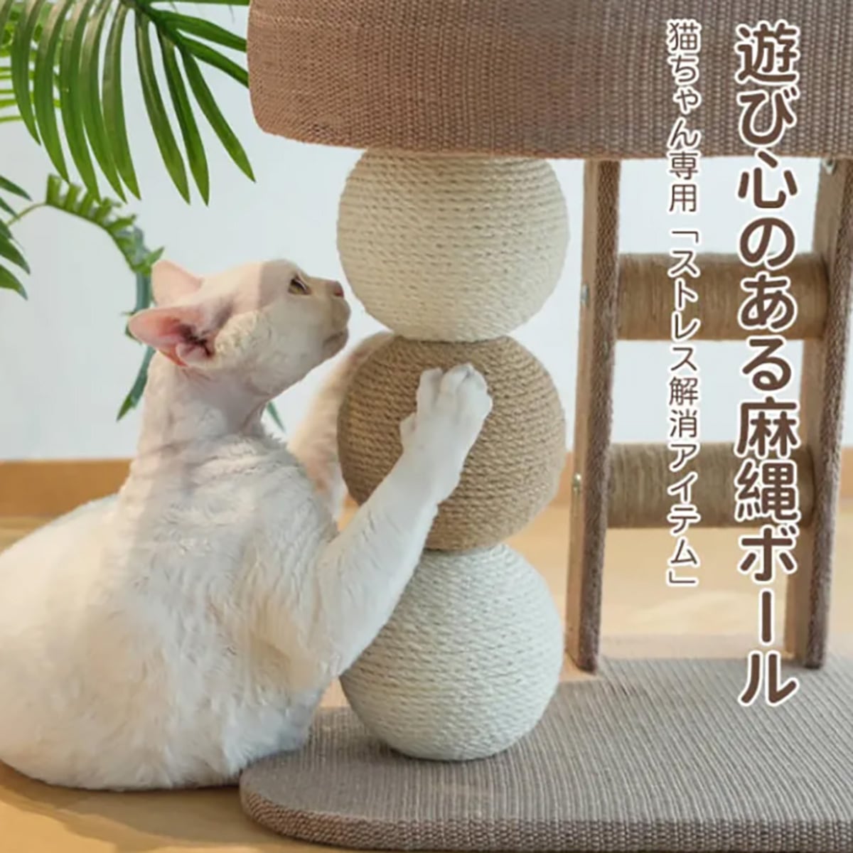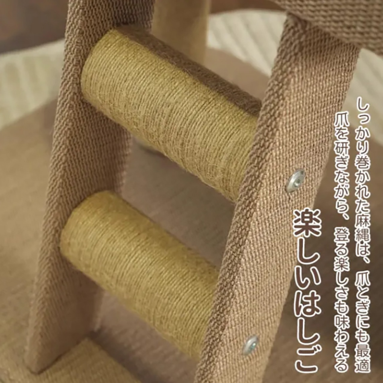 ベッド付きコンパクトキャットタワーは、猫ちゃんの「大好き」を詰め込んだ一台。壁にぴったり設置できる省スペース設計で、コンパクトなお部屋にも気軽に置けます。丈夫な天然サイザル麻の爪とぎポールは研ぎカスが出にくく、遊び心のある麻縄ボールやはしごでストレス解消。広々とした丸形ベッドと見張り台で、ぽっちゃり猫ちゃんも多頭飼いのお家も安心です。揺れにくい安定構造とひんやりマット付属で、一年中快適な猫ちゃんのくつろぎ空間を提供します。