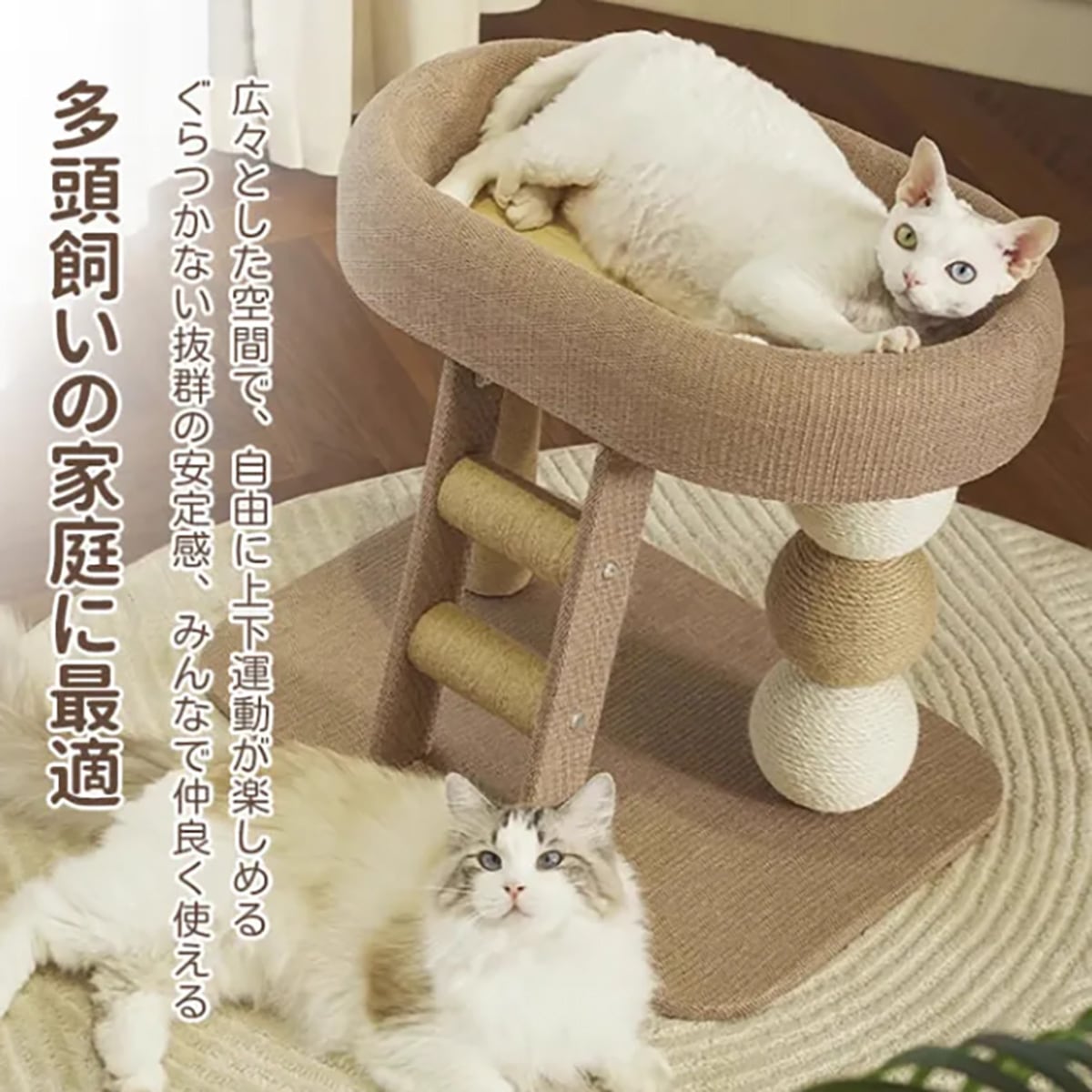 キャットタワー コンパクト ベッド付き 多頭飼い対応 省スペース 全面サイザル麻 爪とぎポール はしご 麻縄ボール ひんやりマット付属 研ぎカスが出にくい 安定構造 簡単組み立て オールシーズン対応 猫用 遊び場 休憩所 ストレス解消