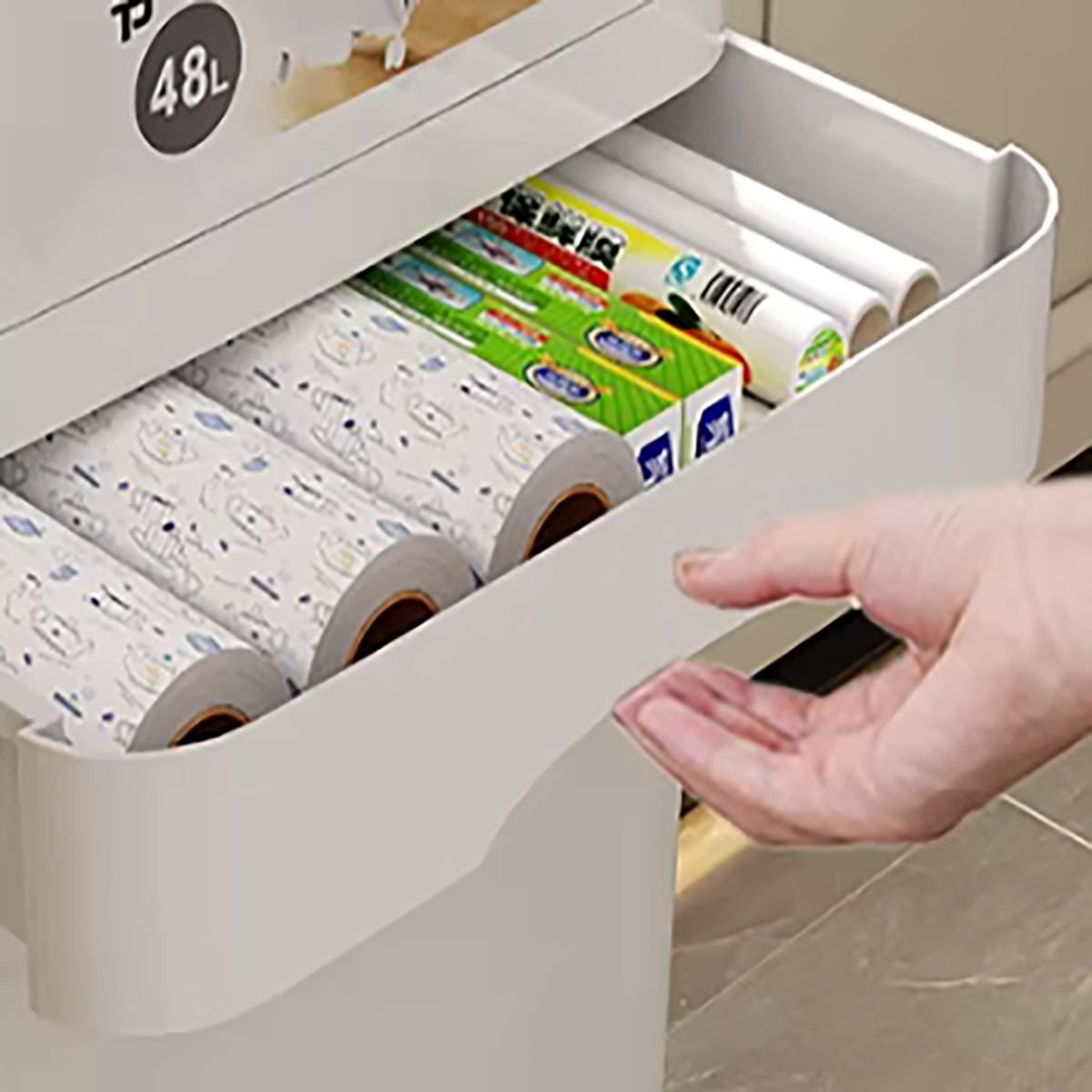 ・【ゴミ袋のすっきり収納と小物整理】引き出し付きデザイン:ゴミ袋のストックや、ラップ、ビニール袋などのキッチン小物を、目立たずきれいに整理整頓できます。