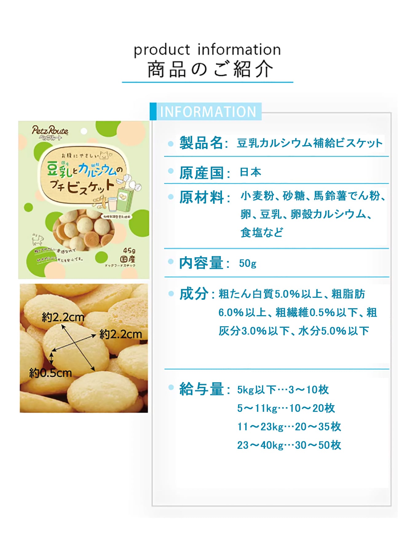 【与えすぎない配慮】愛犬の体重に合わせた明確な「給与量目安」を提示:超小型犬から大型犬まで、体重に応じた適切な量をわかりやすく表示。おやつの与えすぎを防ぎます。