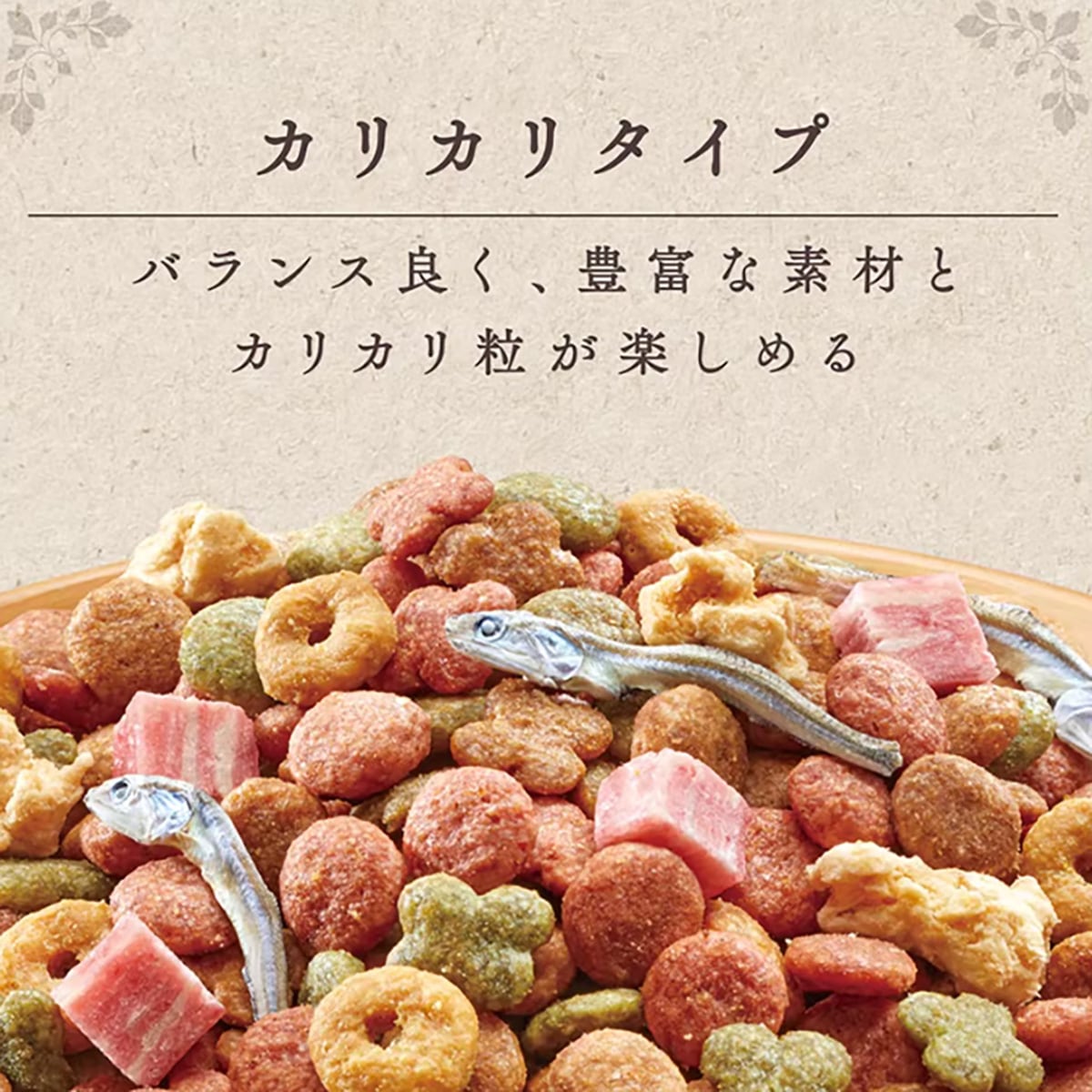 【食いつきを誘う豊富な素材と食感】カリカリの主粒に、軟らかい肉粒、小魚、チーズ風味をブレンド:牛肉、鶏肉、野菜、チーズ、小魚など多様な食材を使用。味と食感のバリエーションで、食欲が落ちてきたり好き嫌いのある愛犬の興味を引き、最後まで飽きずに食べられます。