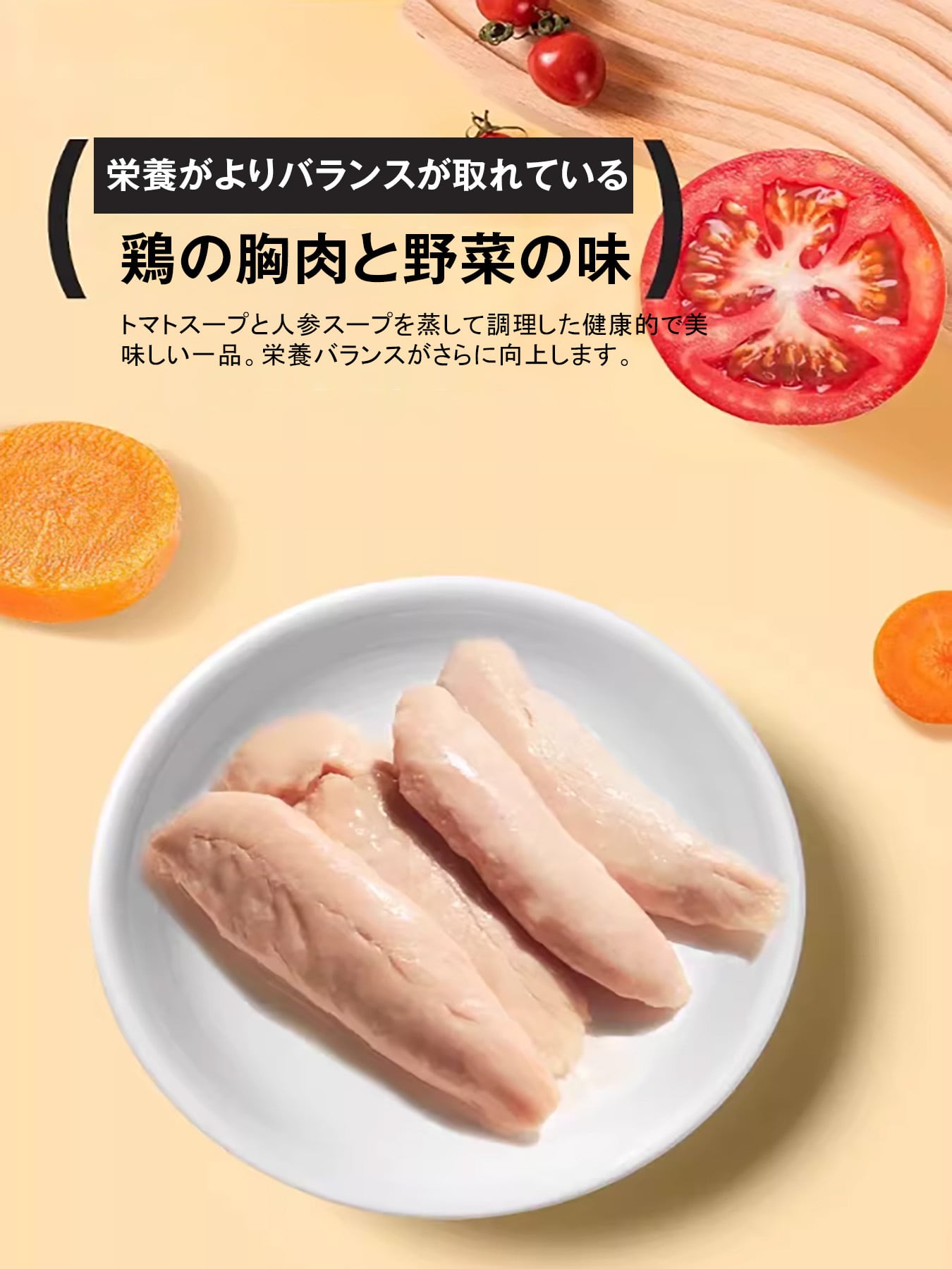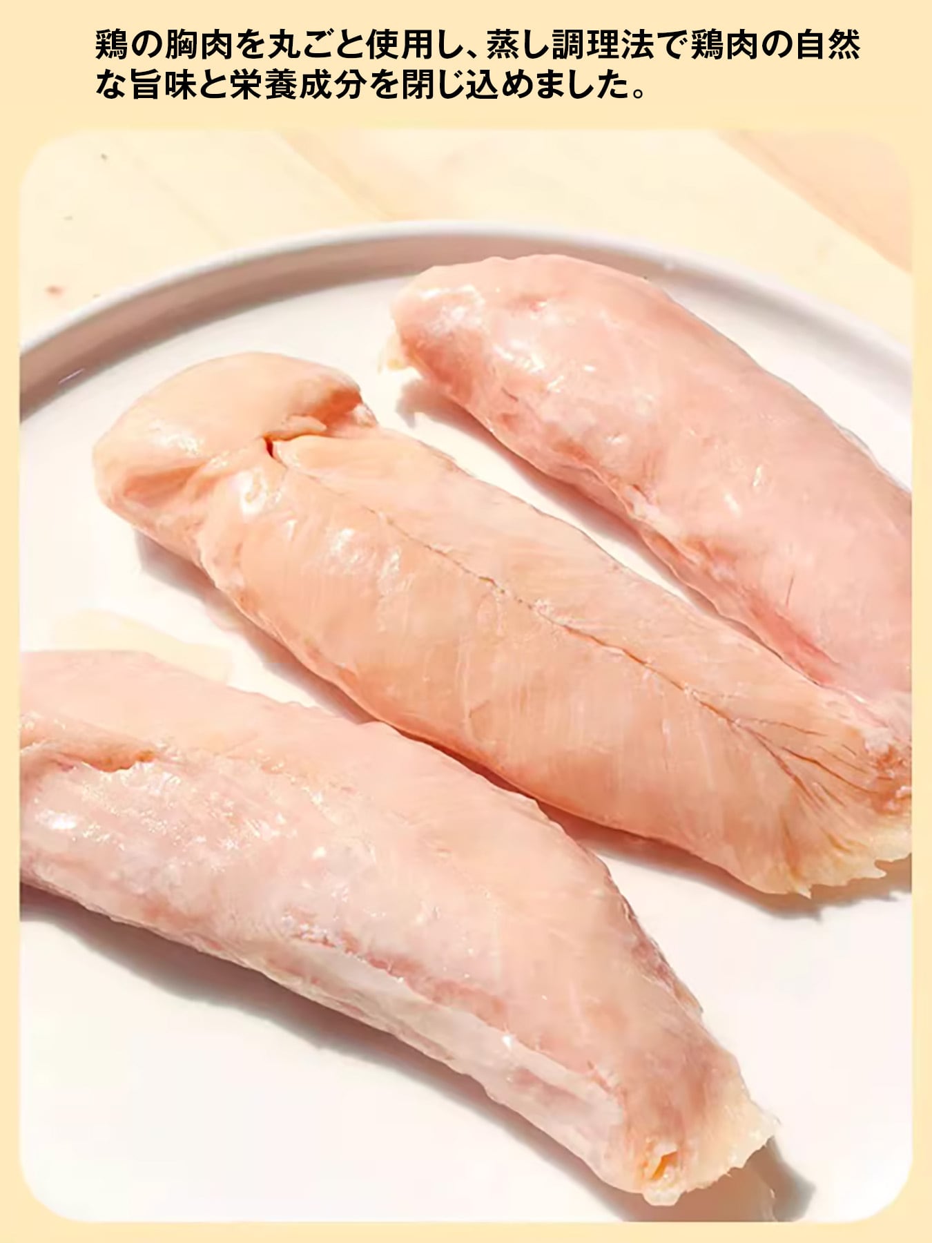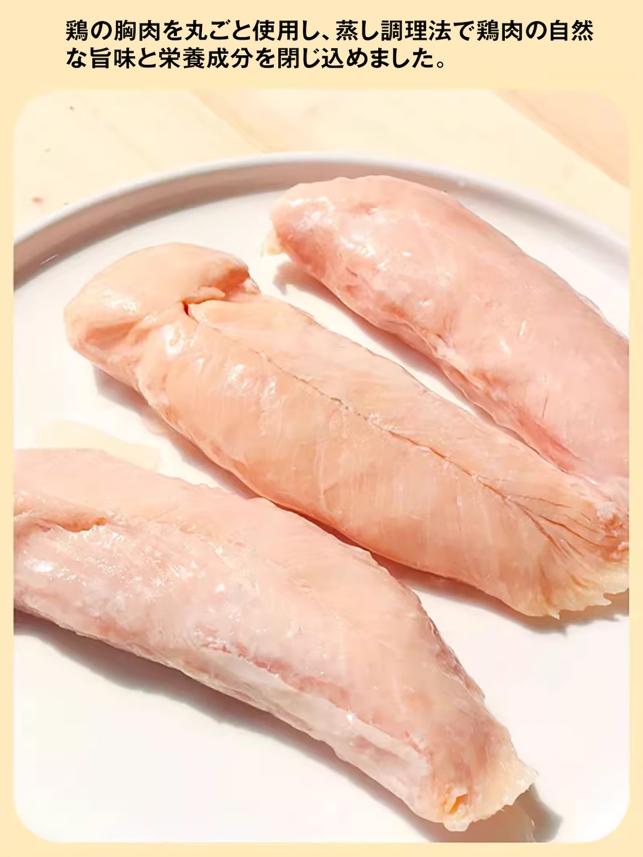 愛犬の食が細くなった、元気に遊ぶための栄養が足りているか心配…? 国産の厳選鶏ささみをシンプルに蒸し上げた、添加物に頼らない、安心のうま味でサポートします。