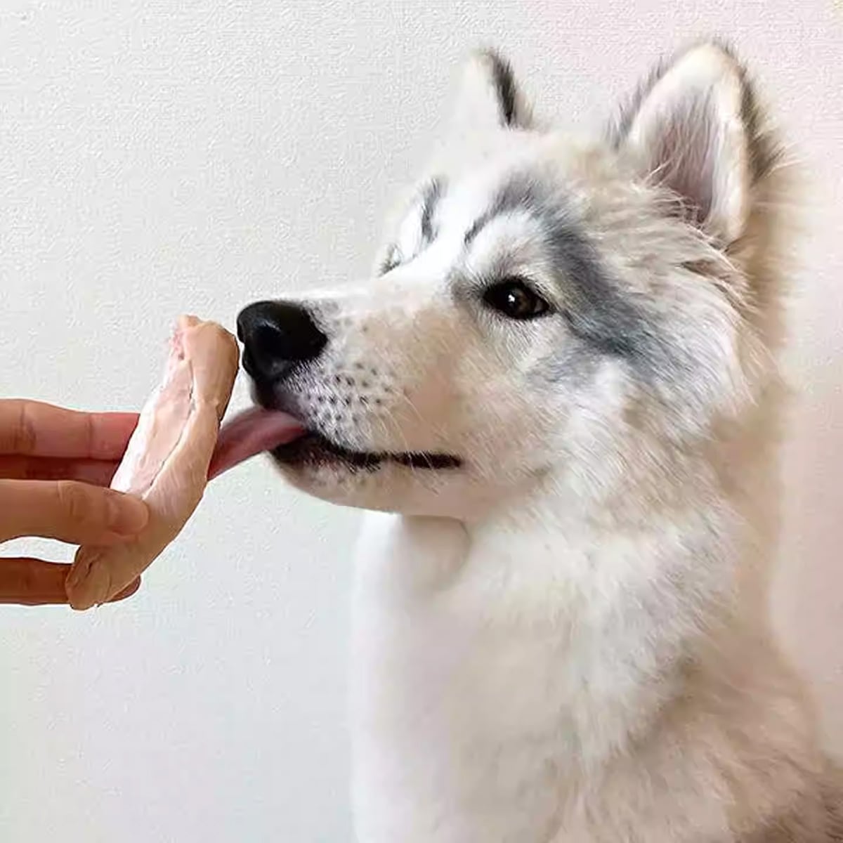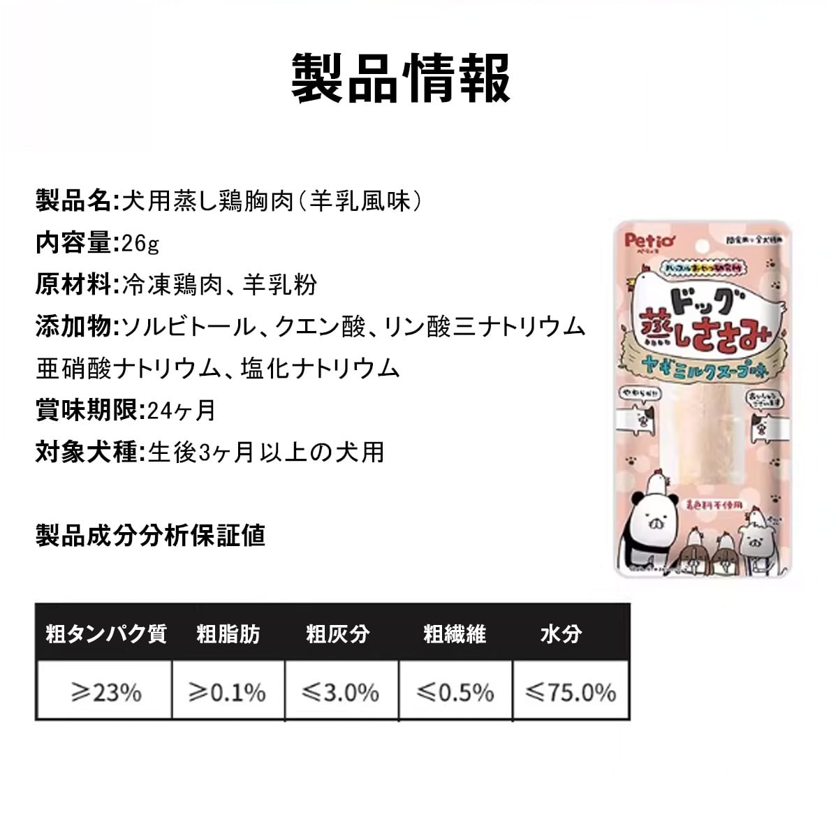 ・アレルギー・給与について:本品には鶏肉、ヤギミルク(味による)等が含まれます。初めて与える際は少量から始め、愛犬の体調をご観察ください。あくまで「おやつ/間食」であり、主食の代わりにはなりません。パッケージの給与量目安を参考に、愛犬の体重に合わせて適量与えてください。