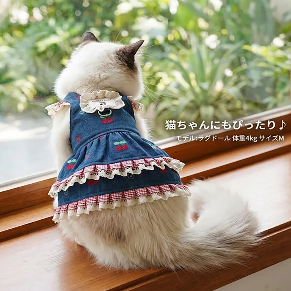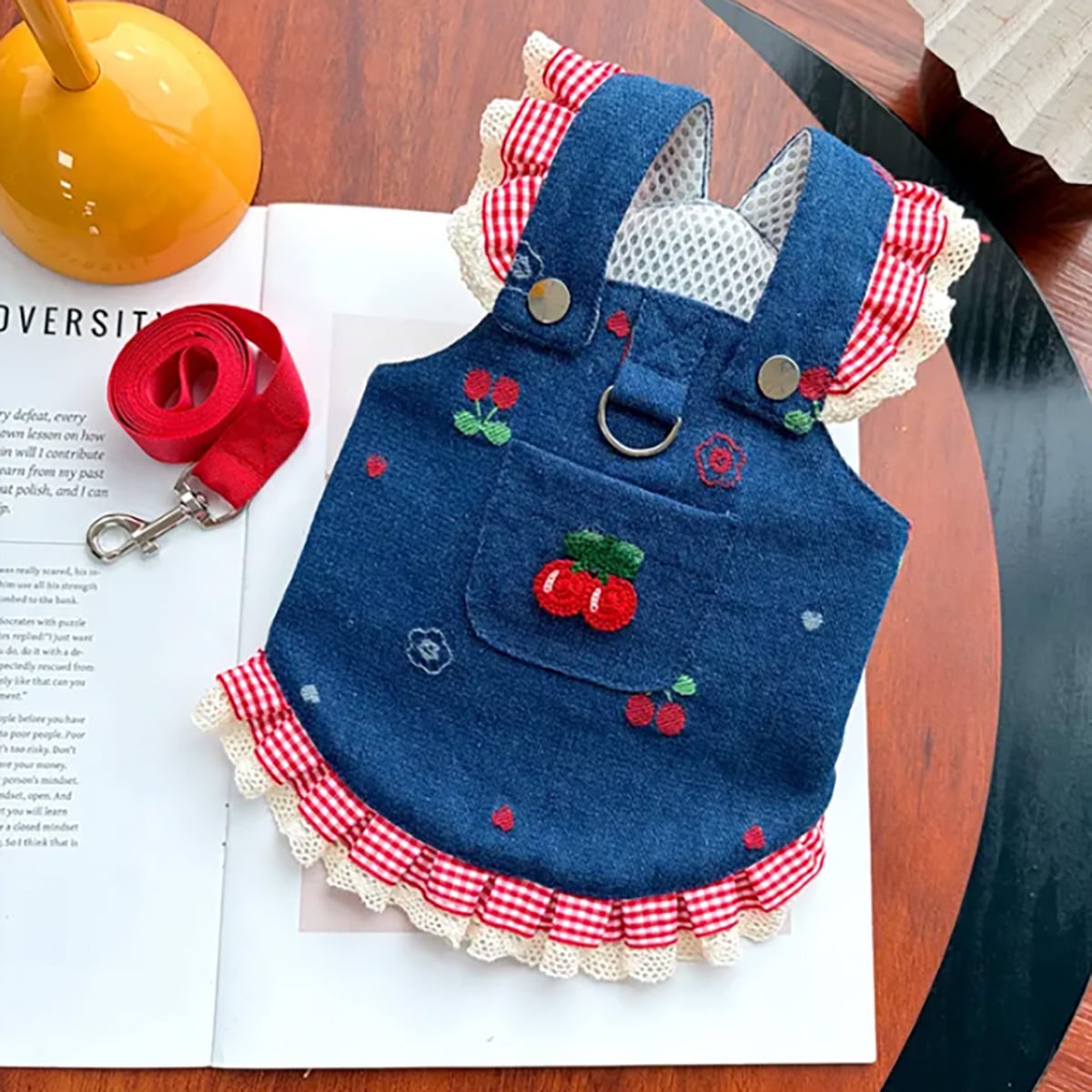 犬用デニムワンピース チェリー刺繍 丈夫なドッグウェア 耐久性 噛みつきに強い 引っ掻きに強い 毛玉防止 丁寧な縫製 春服 新作 スカート サロペット 小型犬 中型犬 猫 お出かけ 散歩 可愛い 通年使用可