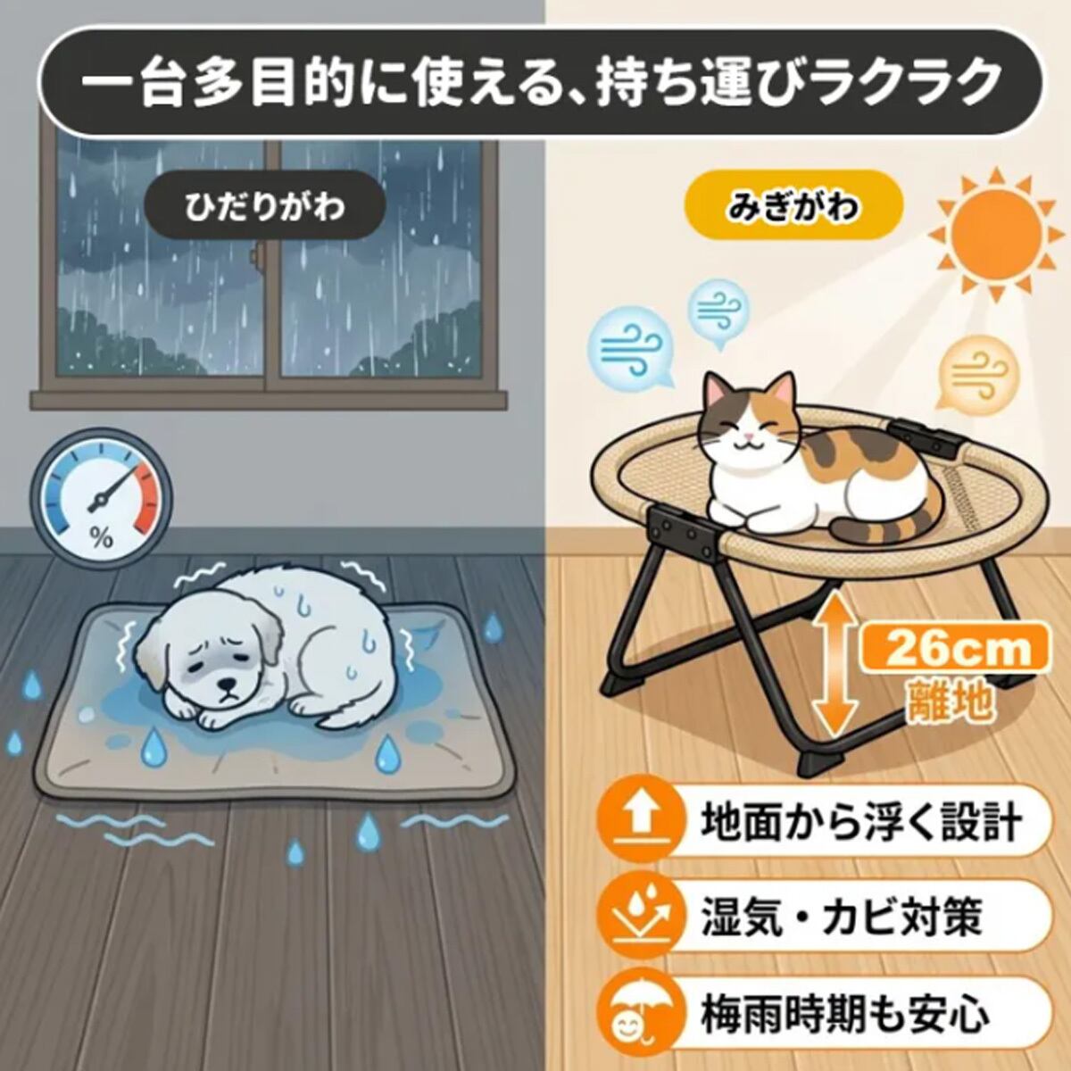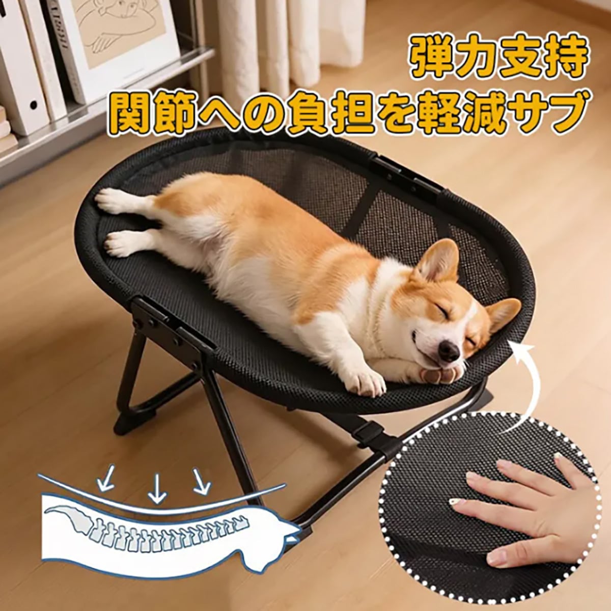 お出かけやキャンプに最適な折りたたみ式ペットコット。高床式デザインにより、地面からの湿気や冷気を遮断し、カビやダニ対策も万全です。通気性に優れたメッシュ素材で、季節を問わず快適な寝心地を提供。足腰や関節への負担を軽減する設計で、大切なペットの健康を守ります。軽量で持ち運びも簡単、室内外問わず幅広いシーンで活躍します。